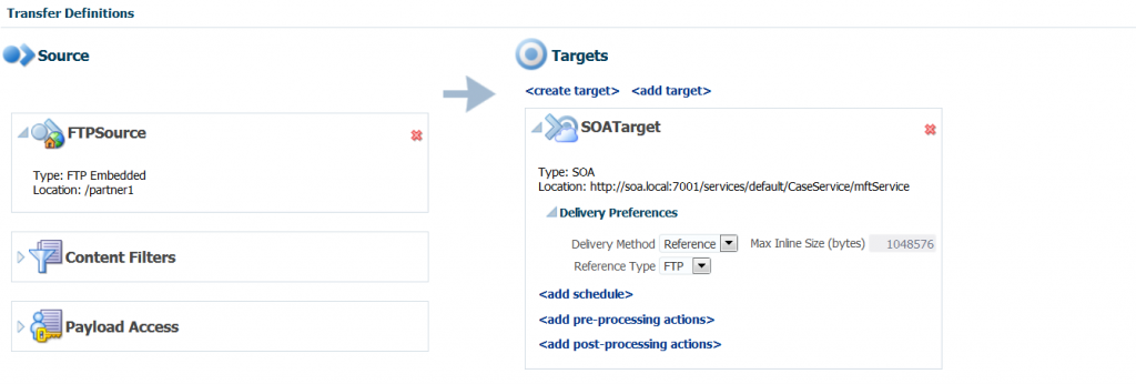 With most types you don’t have any extra options then to specify a subfolder. FTP and File targets for instance can be used in multiple transfers but can still route file to a different subfolder. The other types (non file targets) like ODI, B2B, Healthcare have the extra delivery option to pass the content of the file as reference or als inline binary. The one(s) that stand out are the SOA, Service Bus and SOAP types. These types have a special delivery option where you can pass the content as reference or as inline binary. When you choose reference you can select the type of reference, (s)FTP or File. The SOA Composite will receive a message with the reference to the file as a FTP url or a File path to the (local) file system.