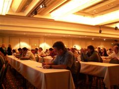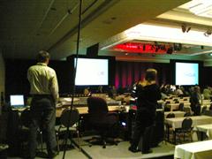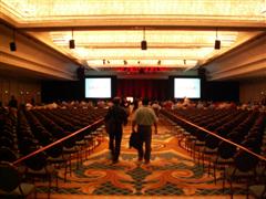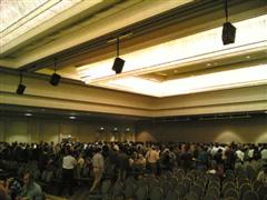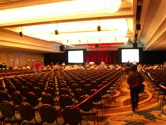 So why did I come up with such a title? Because I got the feeling I was attending a rock concert. The grand ballroom in which it was held was really huge, a heavy bass drum from House / New Age music rolled through the air. Two big screens were setup behind the podium and, when Thomas Kyte went to his desk, a dark heavy voice introduced him to the audience with an ambiance as if it was a big football stadium.