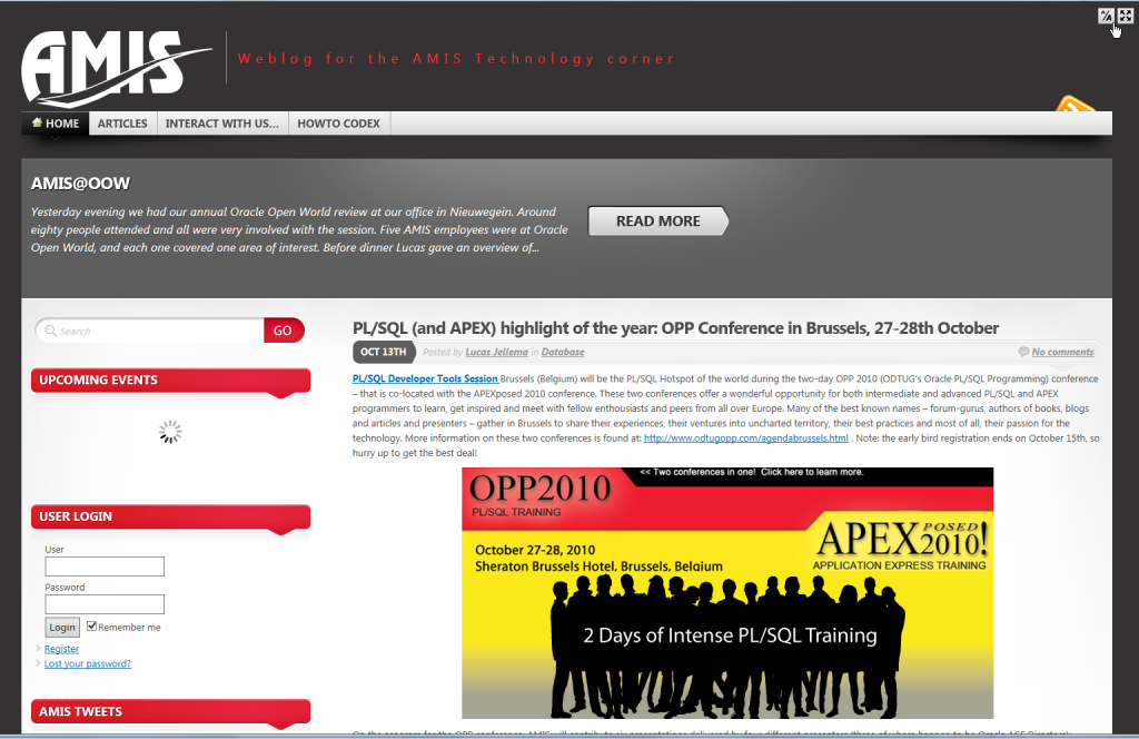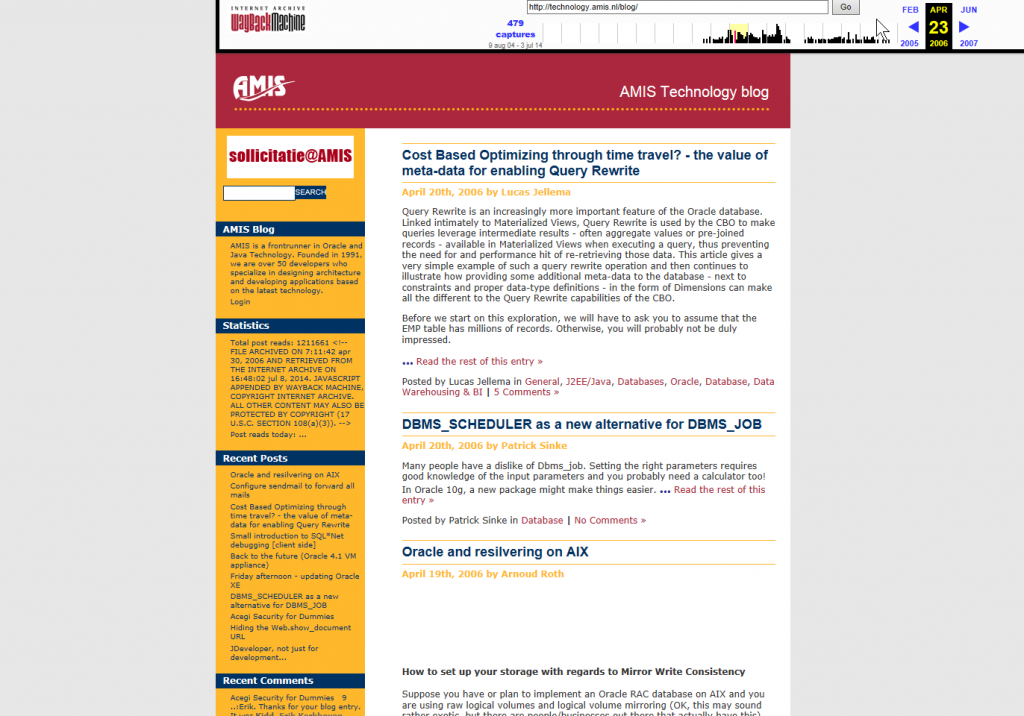 It is July 2014 and the AMIS Blog celebrates it’s 10th anniversary. While diving in the history of the AMIS Blog it is very interesting (amusing and somewhat shocking) to see were we came from. Using the Internet Archive (https://archive.org) I made some screenshots of the AMIS blog depicting the different styles. We made 3 major steps in the design of the blog. Please join me for this trip through memory lane….