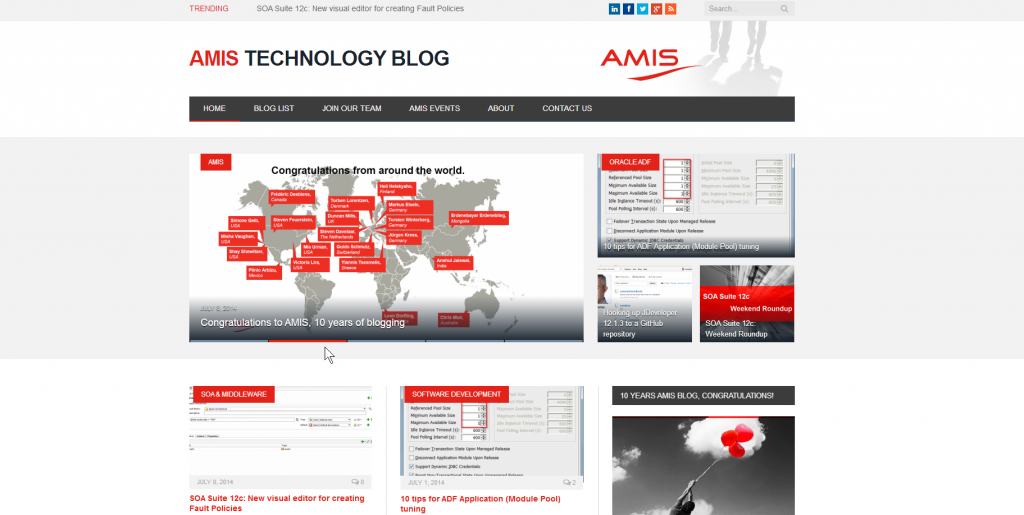 In 2014 we treated ourselves with a gift in the form of a new template compliant with the AMIS corporate style. A clean blog template with more possibilities to engage interaction with AMIS and our bloggers. A magazine style homepage with a more prominent place for categories to present an overview of our recent articles. Social media got a more prominent place in a “connect with us”- bar at the top of the page. We improved the comment option and added an easy social sharing bar at the bottom of each article.