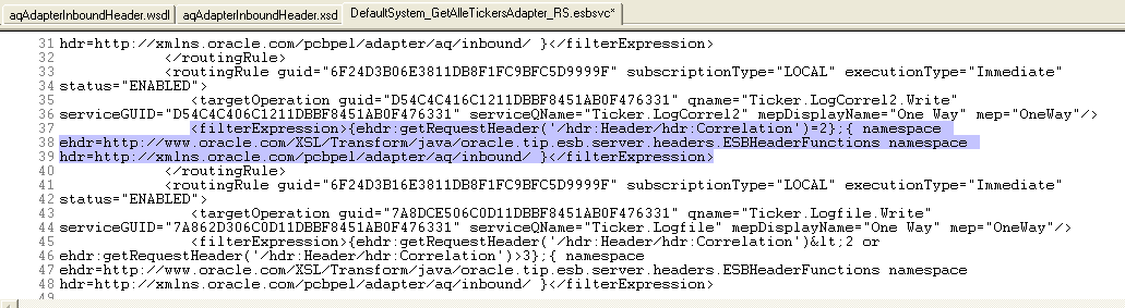 Check out file aqAdapterInboundHeader.wsdl. Either it will have a definition for an element called Header or it will have an include node pointing to a file aqAdapterInboundHeader.xsd. Figure 3 shows the content of my schema definition file. The XPath expression to get to the correlation ID = /Header/Correlation. Whenever this expression is used it has to be prefixed with the proper namespace. In this case the targetNamespace shown highlighted in figure 3.