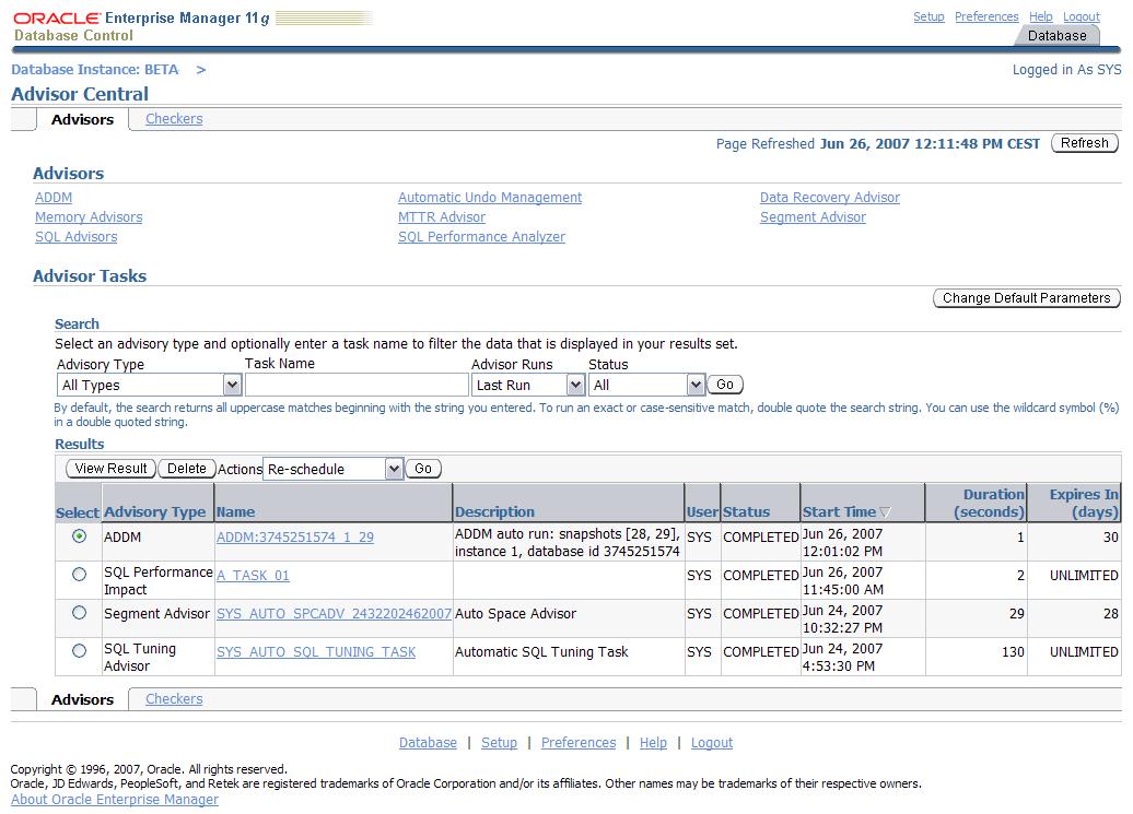 Now straight into the more interesting Oracle 11g DBConsole features. Let’s start using the SQL Performance Analyzer and doing so make use of Replay. The Performance section of the DBConsole utility has a link to Advisor Central. The Advisor Central has again two sections: The Checkers section and the Advisors section.