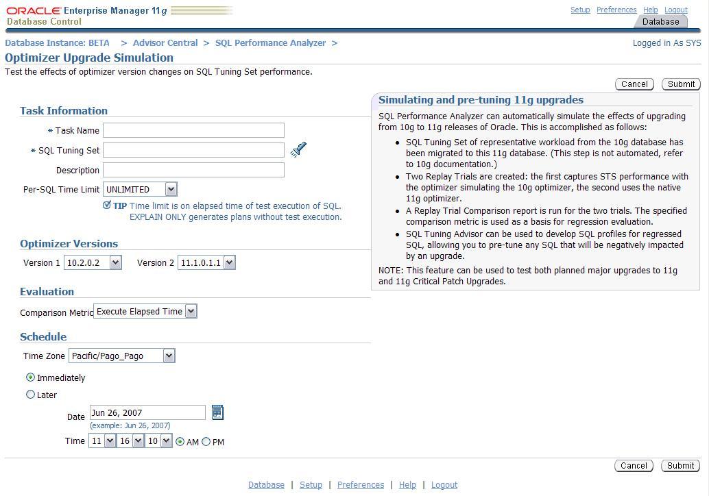 The SQL Performance Analyzer is a very powerful toolset that can help you with new deployments, analyze the impact of a database change or for see the results dealing with database upgrades. The whole SQL Performance Analyzer Guided Workflow process becomes more reliable via the error overview control page. Combined with the Database Replay, SQL Replay features of the Oracle 11g release, these tools will certainly decrease risks while, for example, implementing changes. The Guided Workflow section of the SQL Performance Analyzer also makes it very simple to implement a strategy and oversee the consequences.