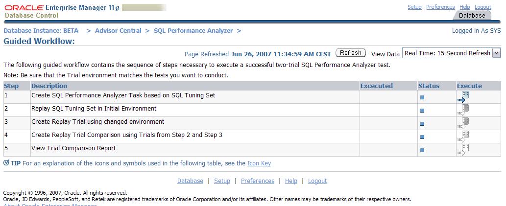 OK, I created now a tuning set based on an APEX schema; let’s see what we can do regarding performance testing via the rest of the Guided Workflow tour. I got back to the Guided Workflow and executed the first step again.
