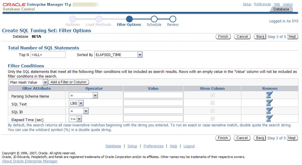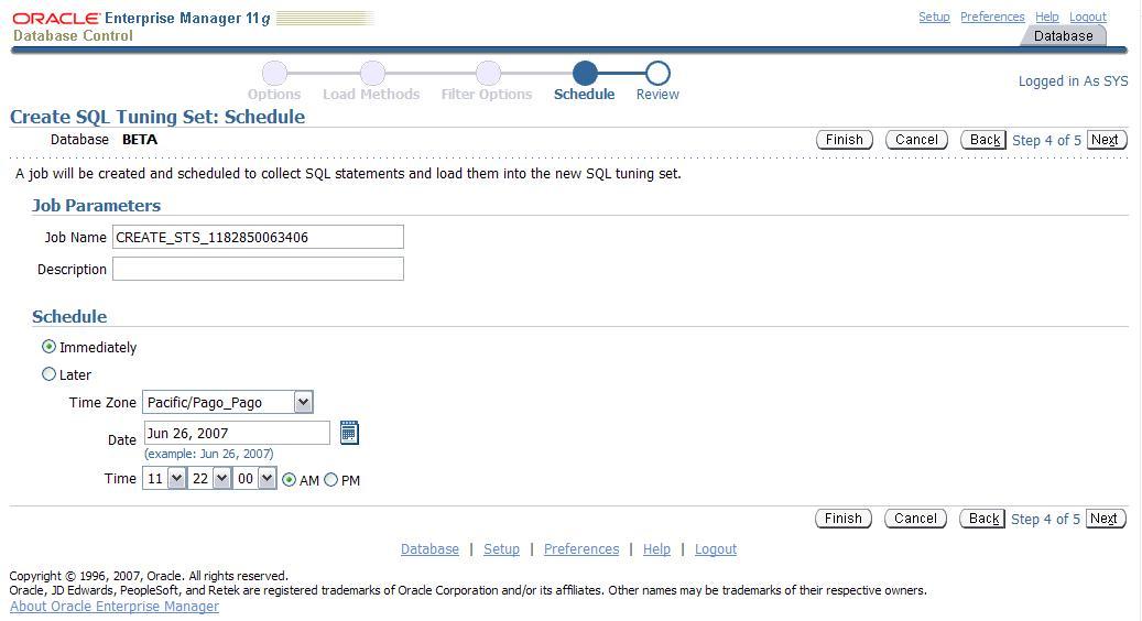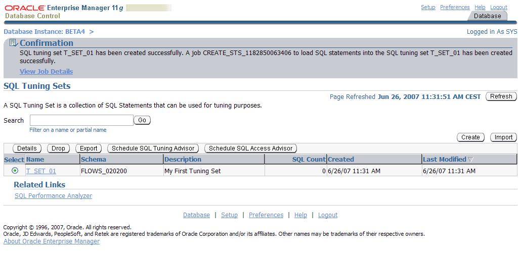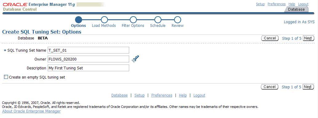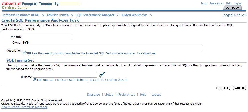 I don’t have a SQL Tuning Set yet, so I clicked the “Link to STS Creation Wizard” URL. That forwarded me to another page.