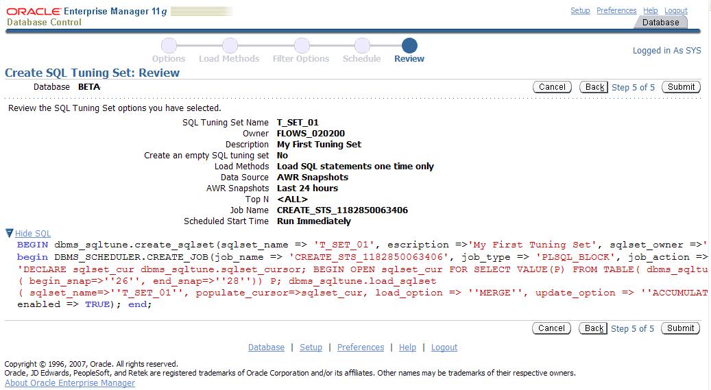 The review page shows a summery and the PL/SQL block to be executed. Here I submitted the created tuning set. The following screenshot show the succesfull creation of my first STS 😉