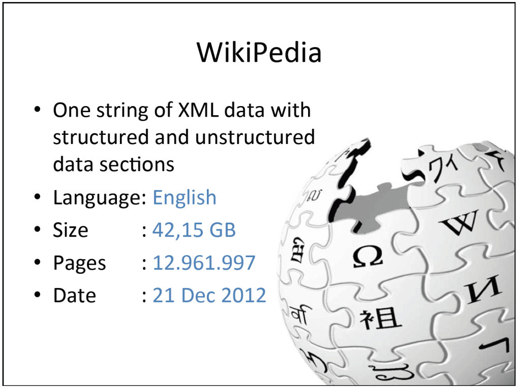 For this years Hotsos symposium I set my own expectations once again a little bit higher, creating a new presentation. With all the buzz going on regarding “Big Data” and its focus on getting unstructured data under control, trying to make use of all this information, I pinpointed on making sense of Wikipedia data. The Wikipedia data is freely available as an XML data dump file on the internet. I picked the biggest data set possible, that is, the full Wikipedia English XML dump file. Last December 2012, it contained over 10 million pages of information. Every “string” (=Wikipedia page) contains structured and unstructured data elements and various from a few KB up to bigger the a few MB. All these pages are distributed in 1 big XML file.