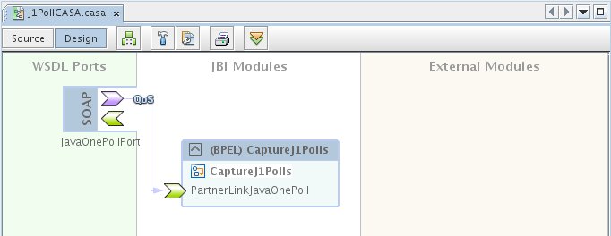 The graph indicates that whenever the javaOnePoll web service is called, the request is passed on to the CaptureJ1Polls BPEL module. Building and deploying the Composite Application to OpenESB results in the following output in the NetBeans log: