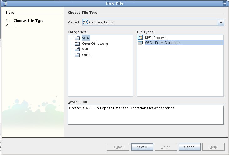 In order to be able to store the data to the database, we need to setup a partner link to the database. Every partner link is based on WSDL so we need to create a WSDL based on the database. NetBeans has a nice wizard for this. To start the wizard, go to the CaptureJ1Polls project and choose File -> New File -> SOA -> WSDL From Database
