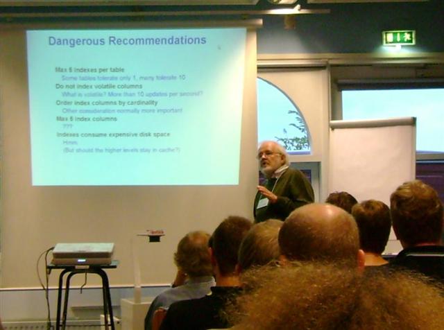 After enjoyed a great meal; on to Cary Millsap’s presentation. Since I had seen Cary during Oracle Open World in 2006, were his presentation saved my day regarding all the bad ones I had seen that day, I am a fan (al least regarding his top notch presentation style) despite you can argue if the method “R” is the sole solution to all and everything. Also having been on Hotsos, most of Cary’s presentation was know to me. Despite this I enjoyed most of it including the much heard story about “Bob” (and its implied message: stay on topic before profiling the “kissing” part 😉 )