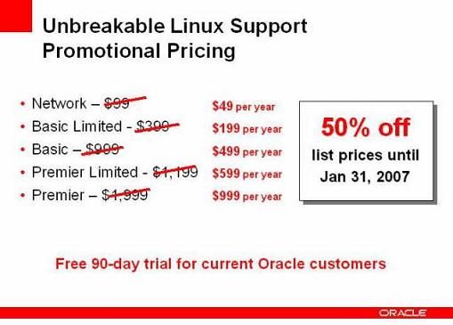 It will be very easy to get in the near future your patches, fixes and back ports for Red Hat Enterprise Linux 3 (RHEL3) and Red Hat Enterprise Linux 4 (RHEL4) releases from Oracle by just re-directing the up2date utility to a Oracle subscriber network. Oracle will deliver different levels of support like, for instance, Premier Support, Basic Support or Network Support (Oracle Enterprise Linux Support Policies). The minimum Enterprise Linux (network) support will cost as less as $99 from the Unbreakable Linux Network. Oracle will offer this support for a price far less then the support price currently offered via RedHat, Mr Elisson said.