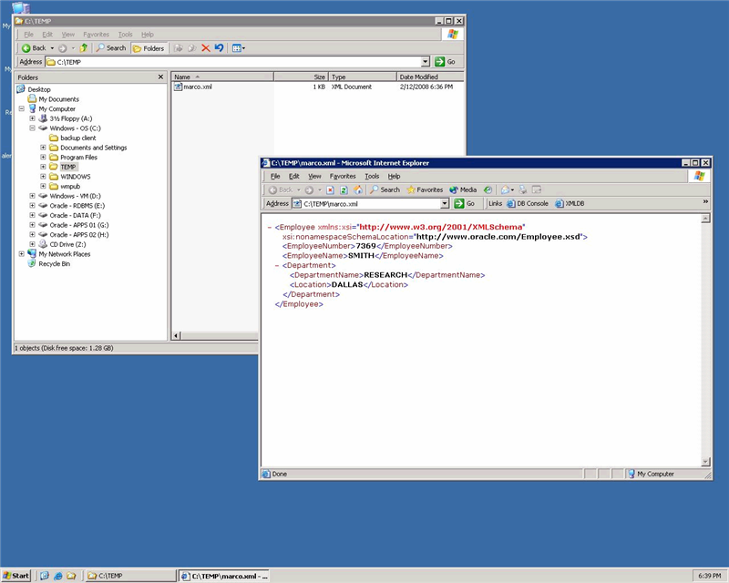I was asked, also after the former post “Selecting (XML) data directly from disk“, what the best way would be to save data directly (locally) to disk via XMLDB methods. I proposed a simple solution based on DBMS_XMLDOM.WRITETOFILE, I will demonstrate this below. My colleague Anton came also today up with an “older” method, at least it was a more appropriate one in Oracle 9.2, but after testing it is looks (I didn’t trace the method, yet) like it is actually faster then my proposed one with DBMS_XMLDOM.WRITETOFILE, in Oracle 11gR1.