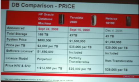 It is hard to read but it says: $650.000 for the hardware + $4000 per TB of data + $1.680.000 for the software licences – database licences for 14 nodes. The total prices comes at under $14k per Tb and apparently that is much cheaper than Teradata and Nietezza and has much better performance results as well.