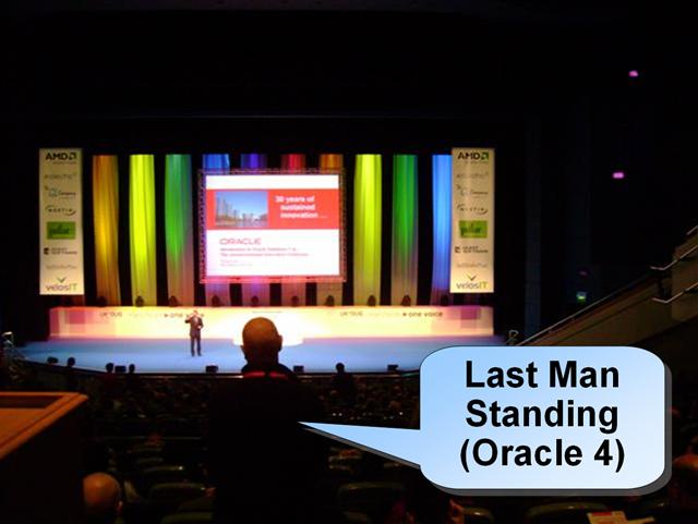The day started off with a two keynote session from Ian Smith and Thomas Kyte. Tom Kyte addressed more or less the same items (“30 years of Oracle”) as Ken Jacobs did during HOTSOS 2007, but now from a more general / developer perspective. He started off by a small exercise were everyone had to stand up and then afterwards had to sit down again when he called out the Oracle database version the person had started with. I started my Oracle experience with Oracle 6 and I was really surprised when almost 75, 80% of the audience sat down when Tom called out version 7.3. There were not that many people left (of the almost 2000 attending in hall 1) when he came to version 7.0. I felt really old in “Oracle years”, but there was still a guy in front of me when Oracle version 4 was announced (and he sat down with the call out of Oracle 3). Tom Kyte himself apparently started off with Oracle version 5.