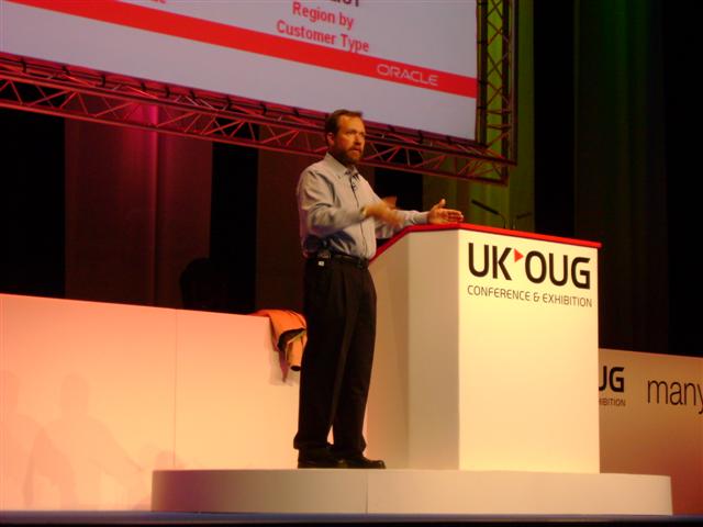 I wanted to attend Toon Koppelaars session about “Data integrity constraints: concepts and trigger design”, but in the end I didn’t and wrote my first UKOUG post in the speakers lounge. Off to lunch (a fine warm meal with great English pastries) and on to Mark Rittman and Mike Durran’s “Oracle Discoverer – Product Roadmap and Integration with Oracle BI Suite Enterprise Edition Plus”. In short the message was: “Yep, we will support Oracle Discoverer still for a long time but you will have to migrate or combine discoverer with BI publisher etc. technology to make use of the extra (new) features”.