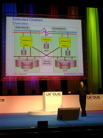 Coffee break again and then off to Julian Dyke’s “Flashback Logging”. I really like the material on Julian Dyke’s website so my expectations were high. Although (we were asked for by Julian in front) I would not give the presentation an overall “excellent”, but that was not caused by the content, but merely the way Julian presented (reading up his own presentation bullets). Something I should remember not to do tomorrow myself… At large, the presentation gave me a good (in depth) oversight of the pros and cons of using database flashback technology in an Dataguard environment. Julian labeled it as “poor mans RAC” but I don;t mind (as long as it isn’t a label called “overbooked”).