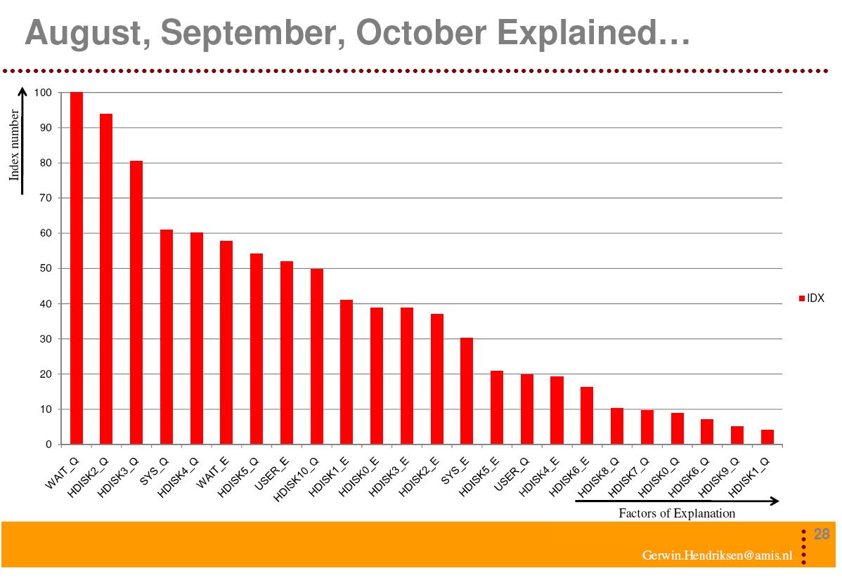 In this graph it becomes clear that “Wait%†and “Disk Busy%†of logical hard disk 2 and 3 from machine “Q†explains the most response time fluctuation of the business process in the months mentioned in the slide. Further investigation should be done on machine “Qâ€. Later in the presentation I have showed that in other periods the “E†machine should be investigated.