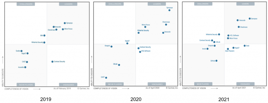 Gartner is a research and advisory company which provides (among others) comparisons of software in so-called magic quadrants. Below you can see the magic quadrant of the ‘Application Security Testing’ category of the past 3 years. This category overlaps with the weaknesses which are described in ISO/IEC 5055 (completely with the security weaknesses and partially with the other weaknesses).