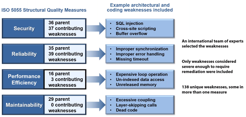 https://www.it-cisq.org/webinars/iso-5055-automated-source-code-quality-measures.htm - CISQ ISO/IEC 5055 weaknesses as documented by MITRE