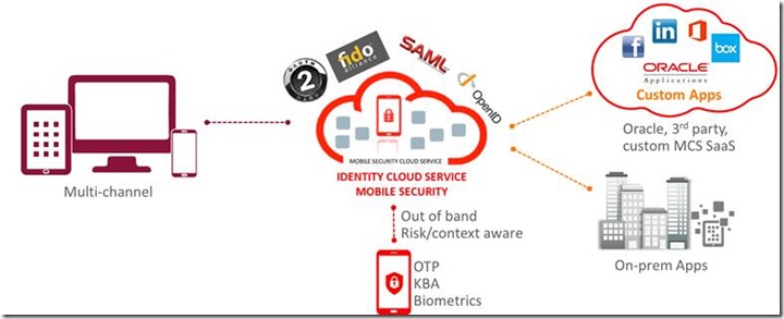 IDCS offers identity governance, directory services and access management. It provides enterprise mobile security and SSO across cloud and on-premises. IDCS is aware of and can work with Social Identities, such as Facebook or Google accounts. It has support for risk/context-aware step up authentication and authorization. It can leverage the mobile device as a factor in multi-factor authentication (check biometric attribute, engage in security token exchange via SMS).
