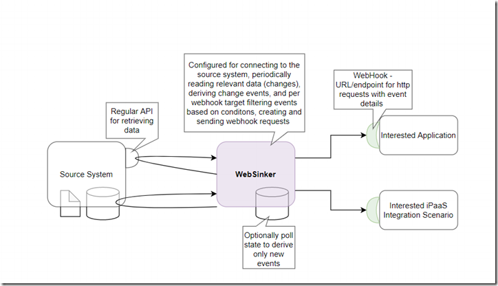 There are integration platforms that can poll the source systems in various ways and from the polling result send something akin to the webhook call. That works fine – in general. However, on some iPaaS platforms, creating such a WebSinker – a polling process to produce the WebHook call – can be difficult or running it can be expensive (depending on how costs of using the iPaaS platform are calculated).