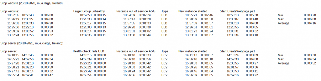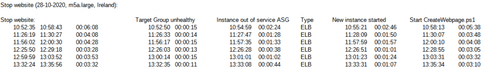 The results for stopping the website is on average 40 seconds faster than the results without using the container. There are about 90 seconds between the fastest and the slowest run. That is pretty much on an average of 3 minutes and 36 seconds. I think we may draw the conclusion that AWS is not designed for using an Auto Scaling Group with one node when recovery time is an issue. When the node is stopped, then using the container is on average 31 seconds faster [2].