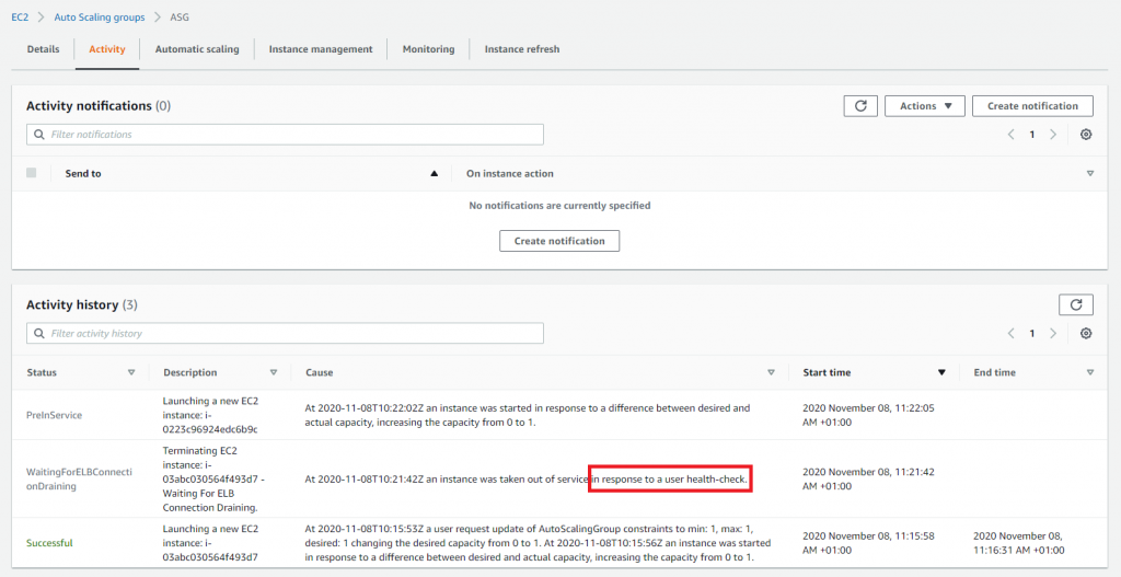 - Instance out of service ASG: when you open the Auto Scaling Group and look in the tab Activity, you will see the message “An instance was taken out of service”. The timestamp of this event is used in the spreadsheet.