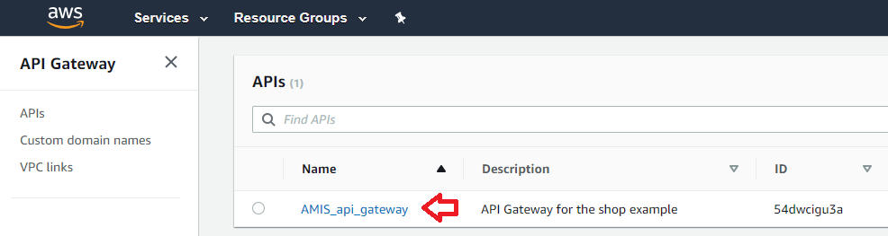 When you go to the API gateway in the region where the shop is running, you can already see the APIs. Click on the link AMIS_api_gateway: