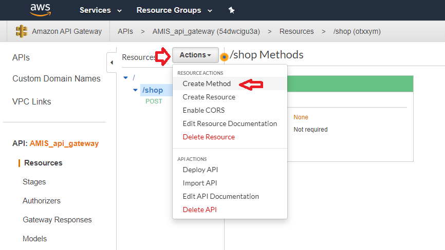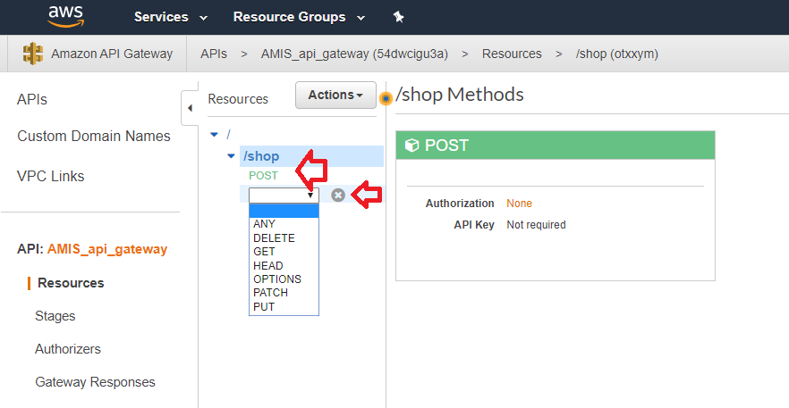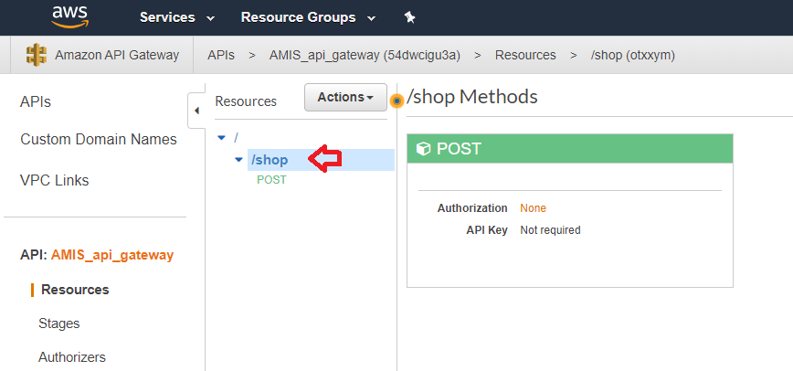 You will come on the screen with resources. Resources are your end points: it is the latest part of the link we use when we send data to the API Gateway. Let’s look at these links: you might have seen the following text when you roll out the shop in your own environment:
