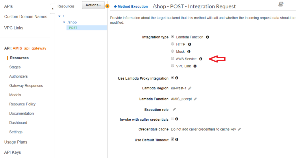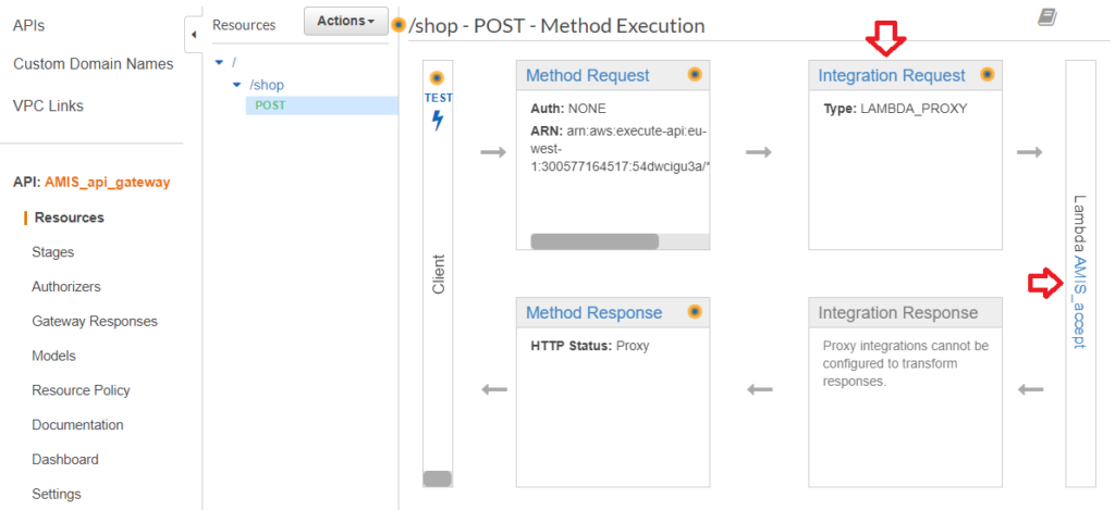 You can now see what the API gateway does (or: can do) for us. We use the Lambda function AMIS_accept (as you see on the right side of this screen), but we could send the message to other AWS services. Click on Integration Request: