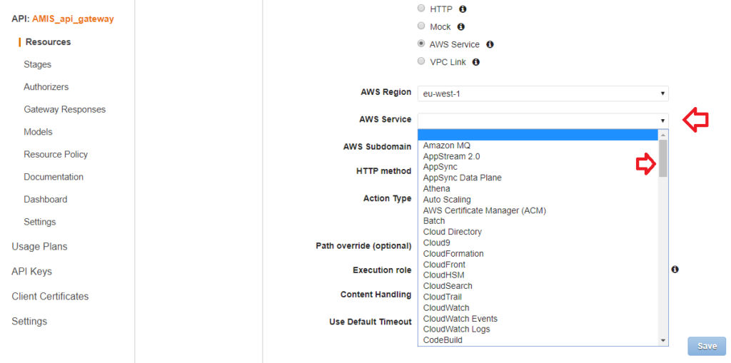 Fill in your region (on the moment I write this blog, I am using eu-west-1, but you can use any region). When you use the scrollbar to go down, you will see an impressive list of services…