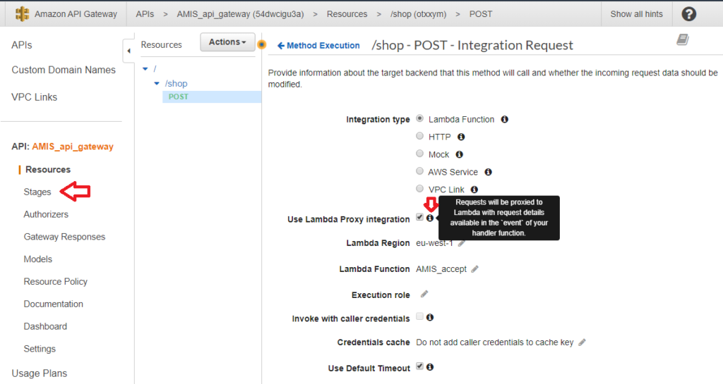 When you click on the Lambda Function radio button, then you can see the configuration for sending messages to our Lambda function. You see, that the checkbox Use Lambda Proxy integration is checked. Hoover over the information button next to it: when you get too much information about the request in the event data of the Lambda function (we currently don’t do anything with it), you might consider to uncheck this checkbox. For now, we leave it as it is. Click on Stages in the left menu: