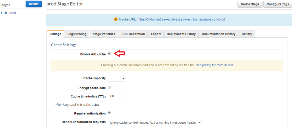 When you get a lot of GET requests and the answers are the same for some time, then you can enable the cache. Requests will not be sent to other AWS services, this might save you time, AWS resources and therefore money. You can specify the cache capacity, can specify to encrypt the cache data (or not) and can set the time to live (TTL) in seconds. For our shop example we don’t use this, so switch it back to off.