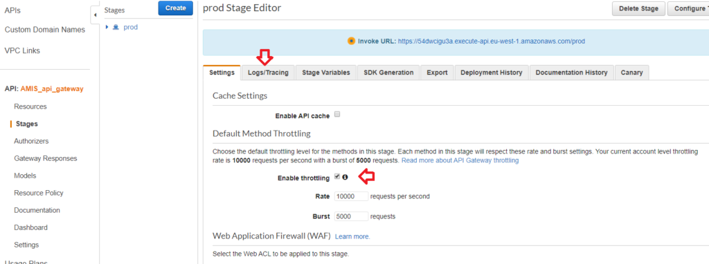 Another nice option is throttling: this is enabled by default. In our case, the allowed rate might be much too high: there is no way in which our cash machines will send 10000 requests per second. Throttling the number of requests per second might lower your bill when some nice fellow will send you thousands of rubbish messages per second. Your cash machines should be able to resend the message, though. Click on Logs/Tracing now: