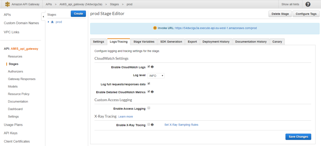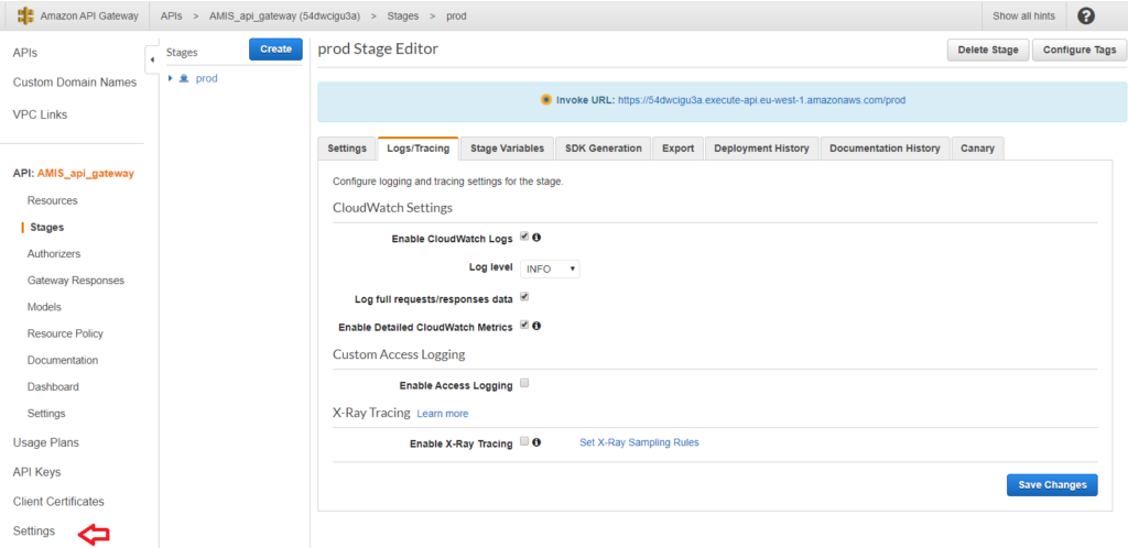 On this moment, our shop uses just one stage: the prod stage. When you click on prod, you will see many settings of the API Gateway. The most important one is, the Invoke URL that you see on top of the screen. You might have noticed that this URL is the same as the URL you saw on the last lines of the output of ./init-all.sh: