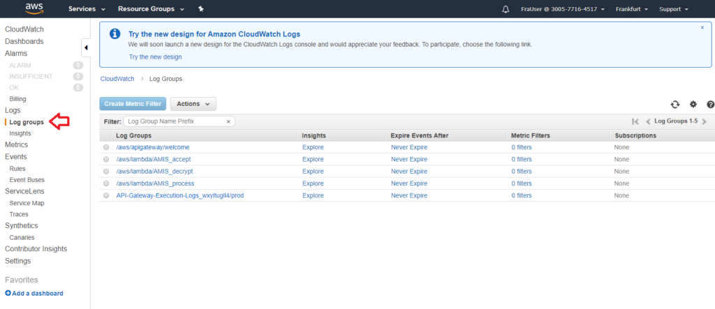 With this configuration, you will get a lot of data in CloudWatch logs. Let’s look at that: go to the CloudWatch service, and click on Log groups: