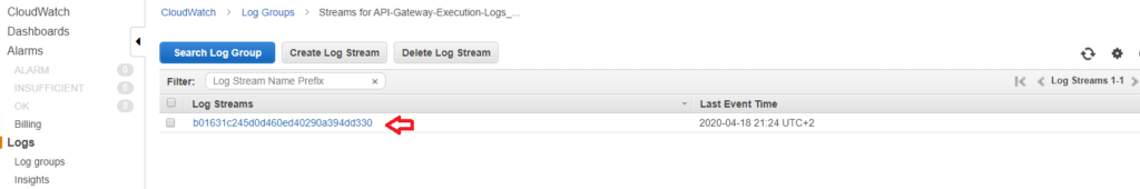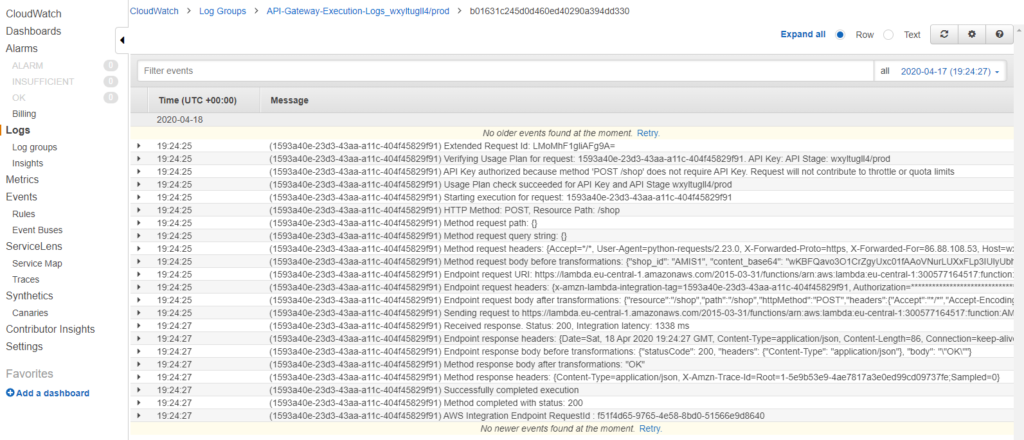 You see two log groups for the API Gateway: one with just a welcome message and the other one with data. Let’s look in the log group with the data (in my case it is called API-Gateway-Execution-Logs_wxyltugII4):. When you click on the link of the log stream, then you see the data that is generated for one message: