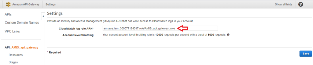 To enable logging, you have to specify the role that the API Gateway may use. Go back to the API Gateway, and click on Settings:
