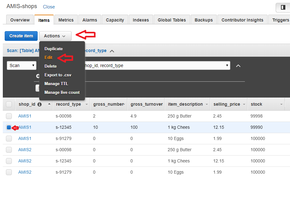 This means, that the combination of shop_id and record_type must be unique. When we use our table to store the stock of our shops, combining the shop_id and the item number makes it unique. When you try to insert a record with the same partition key and sort key, then the old value will be overwritten.