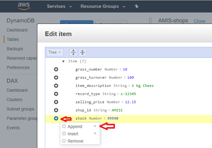 DynamoDB is the NoSQL solution of AWS. The way we use this table in our example is straightforward: the process Lambda function will use an update statement to update the record with the shop_id and the item number: