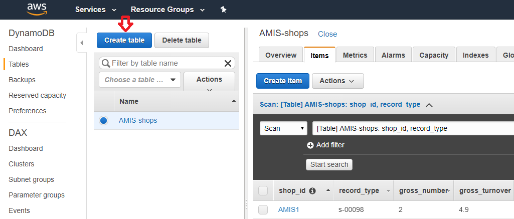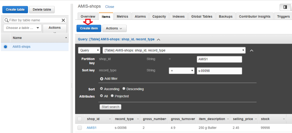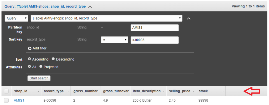 In this table, there is a partition key (shop_id) and there is a sort key (record_type). I will explain more about partition keys and sort keys, but for now fill in AMIS1 as partition key and s-00098 as sort key. We expect to see only the first record: