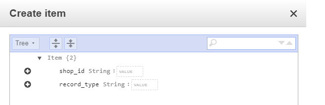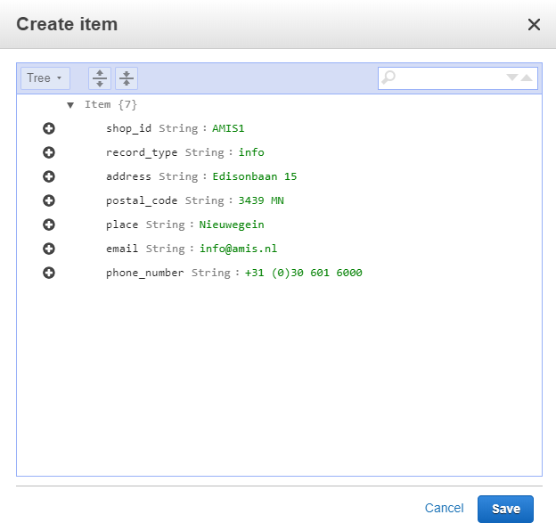 It is possible (and in NoSQL environments not unusual) to store multiple types of information in one table. Let’s try this out: let’s add information about the shop itself in this table. Let’s store the address, postal code, place and telephone number in the same table: click on Create Item: