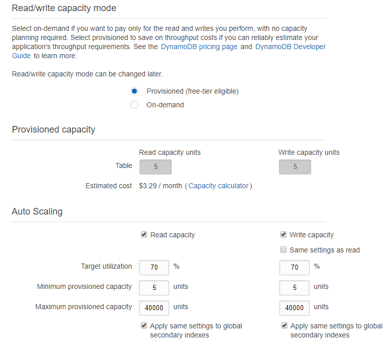 When you scroll down, you see the settings for Read/write capacity mode: