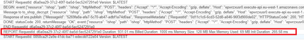 Of course, you will pay a price for that: you pay per request and per GB-second. The number of requests is the same (100 per performance test). You will have much more GB’s (100 x 3.008 instead of 100 x 0.128), but the lead time is lower (for the update_db function: 100 x 88 ms instead of 100 x 450 ms). The costs per GB-second is on the moment of writing $0.0000166667 in Ireland. For my small test, the costs for processing at a higher speed are 100 (records) x 3.008 (MB) x 88 (ms on average) x $0.0000166667 = $0.441174 instead of 100 x 0.128 x 450 x $0.0000166667 = $0.096000. This difference might seem small, but if you have thousands of messages per day instead of the 100 messages in this test, you might decide to lower the number of MBs. You might also consider to increase it only for accepting the message but not for the decrypt and process functions.