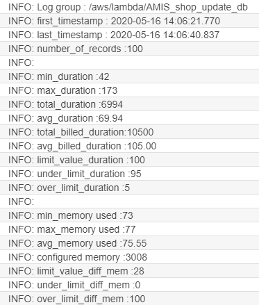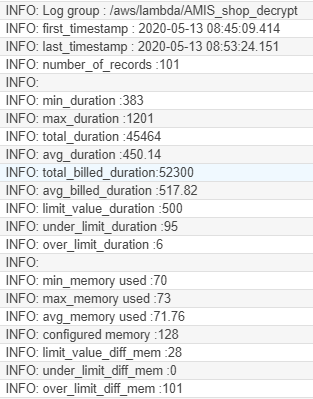 The memory that is used, is between 69 and 72 MB, with an average of 71.48 MB. The configured memory (this is the slider in the Lambda function) was 128 MB. This means, that we are safe: the way we use the function will never lead to problems because there is a large gap between the maximum amount of memory that we configured and the amount of memory that is actually used. We would like to be warned when the amount of used memory is higher than 100 MB, the limit is set to 28 MB (= 128 – 100). All of the records use less than 100 MB (over_limit_diff_mem = 101).