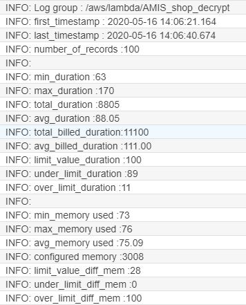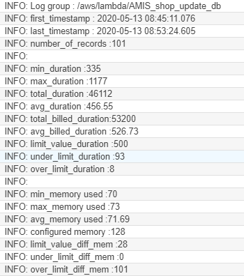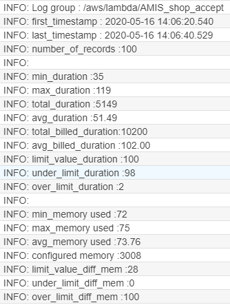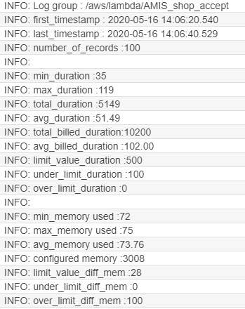 After doing the test, it is nice to have some statistics. I created a Lambda function AMIS_perftest_get_stats for that. Let’s start the performance test, wait for about 3-4 minutes and then start the statistics function and look at the CloudWatch output: