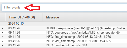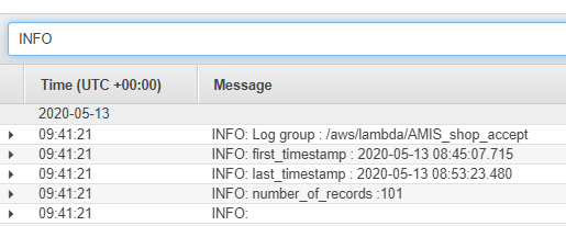 You might have noticed that the way the lambda functions log their data is different to the way this is done in the shop-1 solution. Every line in the CloudWatch logs has an indication of the severity level. You can filter quite easily: click in the bar “Filter events” and then type INFO.