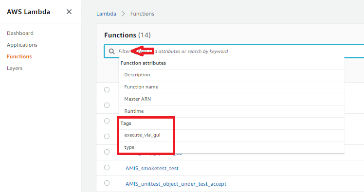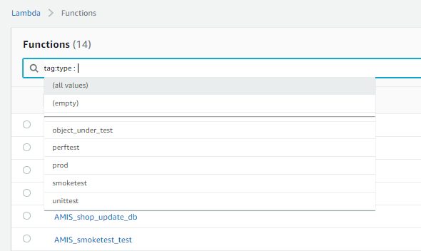 A third solution might help as well. Up to now, we didn’t do a lot with tags. I tagged all Lambda functions with two tags: the first tag is type, which is either “prod” for the Lambda’s that we use for our shop example, or an indication of the type of the function (“perftest”, “unittest”, “object_under_test”, “smoketest”). I also gave each Lambda the tag “Execute via gui”, which can be either “yes” or “no”. When you click in the text box next to the search icon, then you can see the names of the tags: