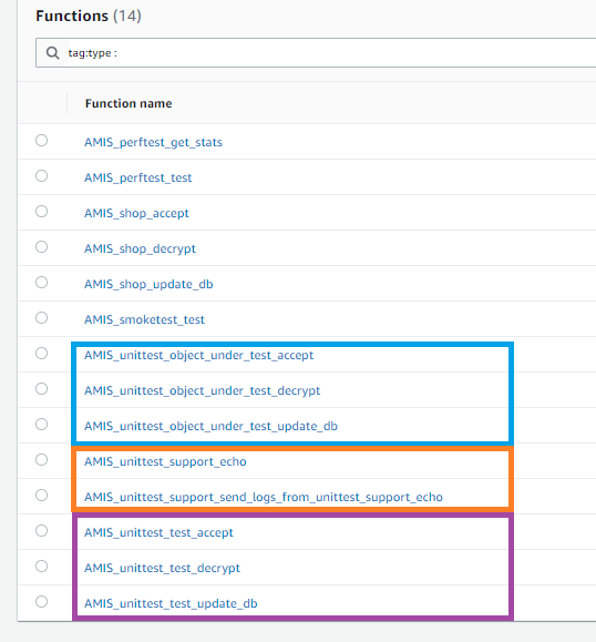 2) I created other accept, decrypt and process functions for the unit tests. These are called AMIS_unittest_object_under_test_<<name>>, you can see them in the blue box. These Lambda functions have the exact same code and the exact same IAM roles and IAM policies as the original ones. Their environment variables are pointing to different objects. I will explain how this works in the next paragraphs.