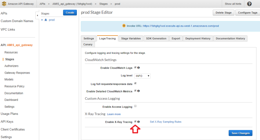 In the API Gateway, you will find the switch on the stage level: go to AMIS_api_gateway > Stages > prod, and click on tab “Logs/Tracing”, you will find the checkbox “Enable X-Ray Tracing” in the X-Ray Tracing part of this screen:
